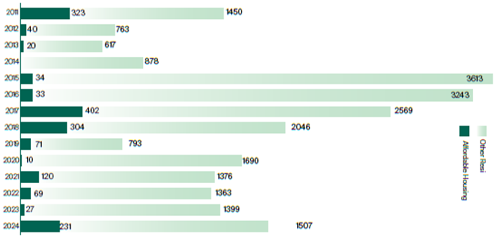 In 2025 (Until June), the share of affordable housing, i.e value of housing units priced under INR 5 mn stood at 17%, a sharp decline from 52.4% in 2018. Thus, indicating decline in affordable housing supply in Indian cities. The receding number of launches in the affordable housing units is primarily attributed to the bottlenecks hindering private participation.