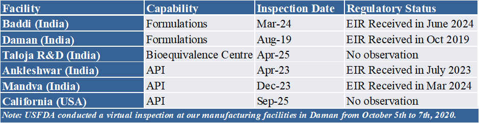 - As of September 30, 2025, the Company had filed 187 ANDAs, 02 NDAs and 01 BLA with the USFDA. It has received approvals for 163 ANDAs (including 17 tentative approvals) and 02 NDAs.